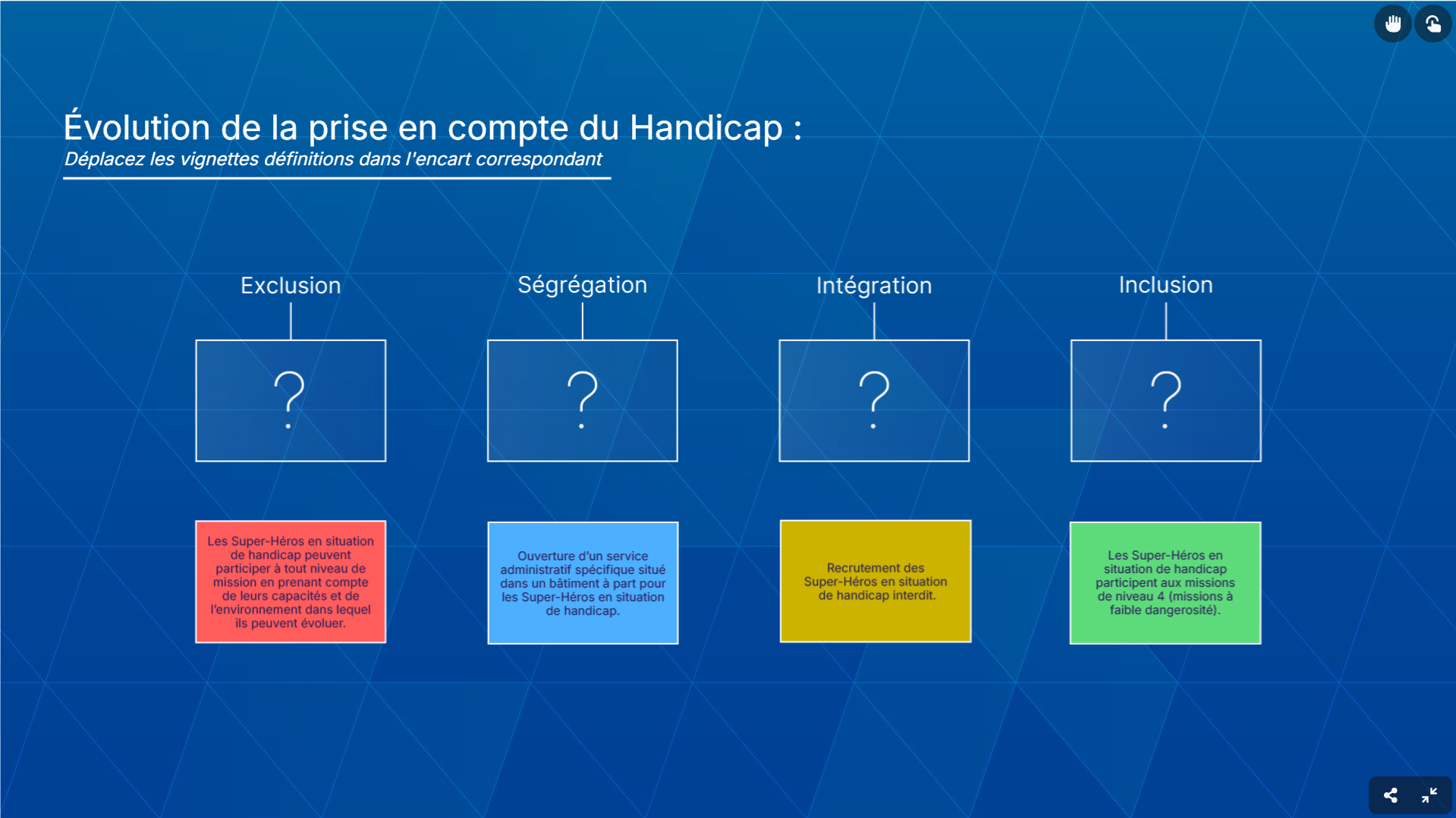 Les participants sont confrontés à des choix et des situations qui reflètent les défis liés au handicap dans le quotidien professionnel. Chaque étape du jeu met en avant différents aspects et thématiques liés au handicap
